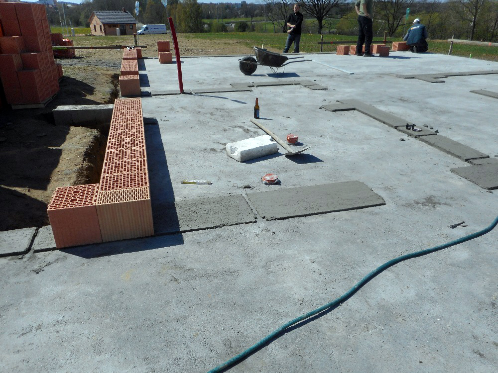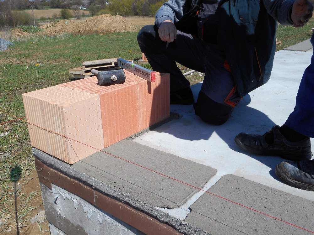 V této ukázce jsou vidět některé naše postupy a vybavení, které při zakládání staveb používáme. Při založení první řady byly použity cihelné bloky HELUZ FAMILY, které se zdily do čerstvě zavadlé vyrovnané maltové lože.